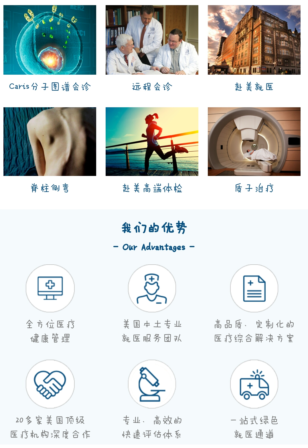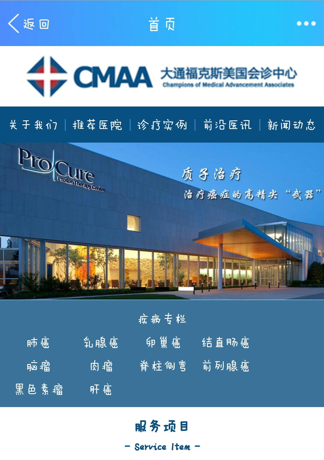 美國冠軍醫(yī)學(xué)聯(lián)盟(CMAA)2009年在美國賓州費(fèi)城成立。大通??怂姑绹鴷?huì)診中心是美國冠軍醫(yī)學(xué)聯(lián)盟(CMAA)旗下機(jī)構(gòu)。中心以“將世界先進(jìn)的醫(yī)學(xué)技術(shù)帶給需要的人”為宗旨,依托美國先進(jìn)的醫(yī)療和健康管理體系、利用美國先進(jìn)的診療技術(shù),滿足中國高層人群多元化醫(yī)療和健康需求。中心擁有9年國際高層醫(yī)療服務(wù)經(jīng)驗(yàn),嚴(yán)格遵循美國醫(yī)療服務(wù)標(biāo)準(zhǔn),擁有嚴(yán)格的質(zhì)控體系及規(guī)范的服務(wù)流程,精心打磨高品質(zhì)服務(wù)產(chǎn)品,成功的幫助了數(shù)千位國內(nèi)癌癥和疑難病癥患者,提高生活質(zhì)量,重獲新生。