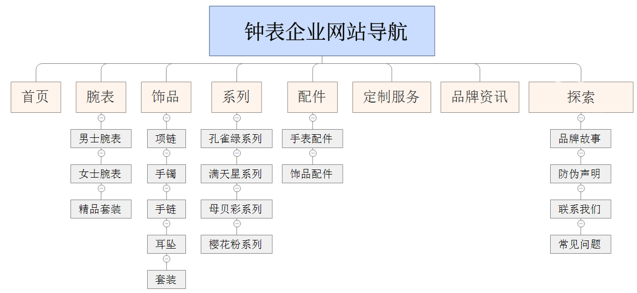 網站導航在設計之初,根據(jù)鐘表企業(yè)企業(yè)品牌銷售策略,可在以下導航的基礎上,調整、增加、刪減導航,以更符合鐘表企業(yè)的官方商城定位。